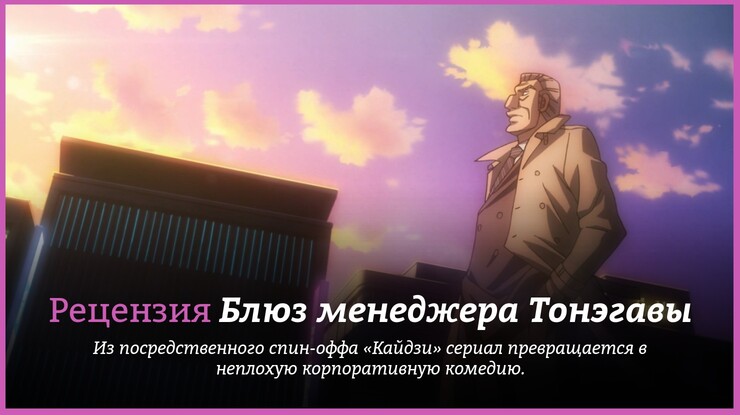 Когда было объявлено, что новым проектом студии MadHouse во вселенной «Кайдзи» станет экранизация юмористической манги про будни менеджера Тонэгавы, описать первое впечатление словом «разочарование» было недостаточно. Ну не такого ждёшь семь лет. И тем обиднее сделалось, когда сериал стартовал: первые эпизоды можно было назвать в лучшем случае посредственными. Бессмысленно растянутая на две серии шутка про то, что Тонэгава не может запомнить имена похожих друг на друга подчинённых в чёрном, исчерпала себя ещё в первые пять минут. А то, что по трети эпизода шли мини-рекапы из «Кайдзи», лишь сыпало соль на рану.